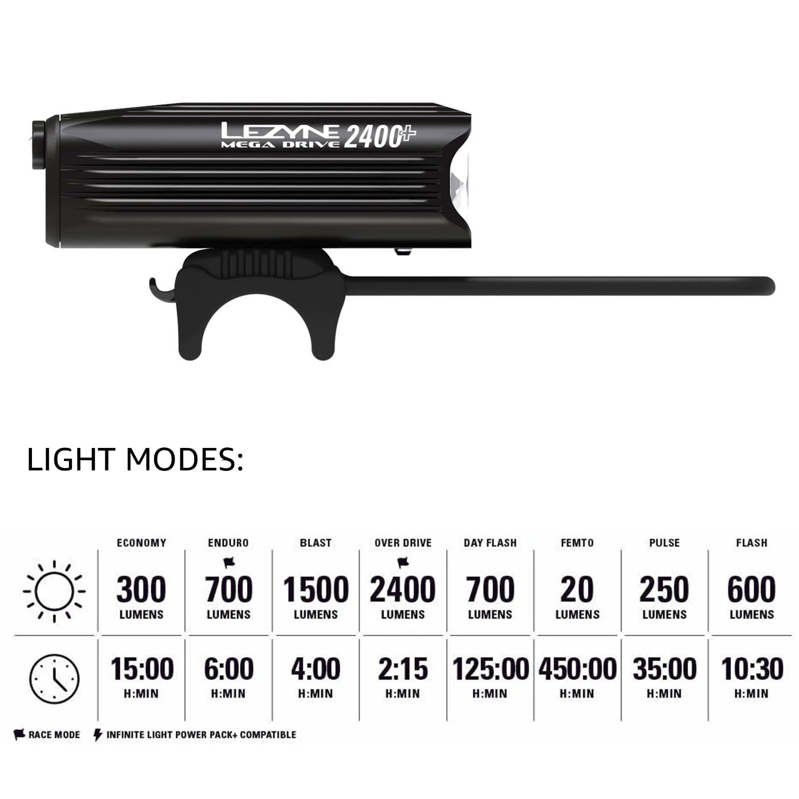 POWERFUL ILLUMINATION - The Lezyne Mega Drive 2400+ delivers an incredible 2400 lumens of output, making it the most powerful light in the Lezyne lineup; This high-lumen output is ideal for serious night riding, ensuring you can see every detail on the trail or road, even at high speeds