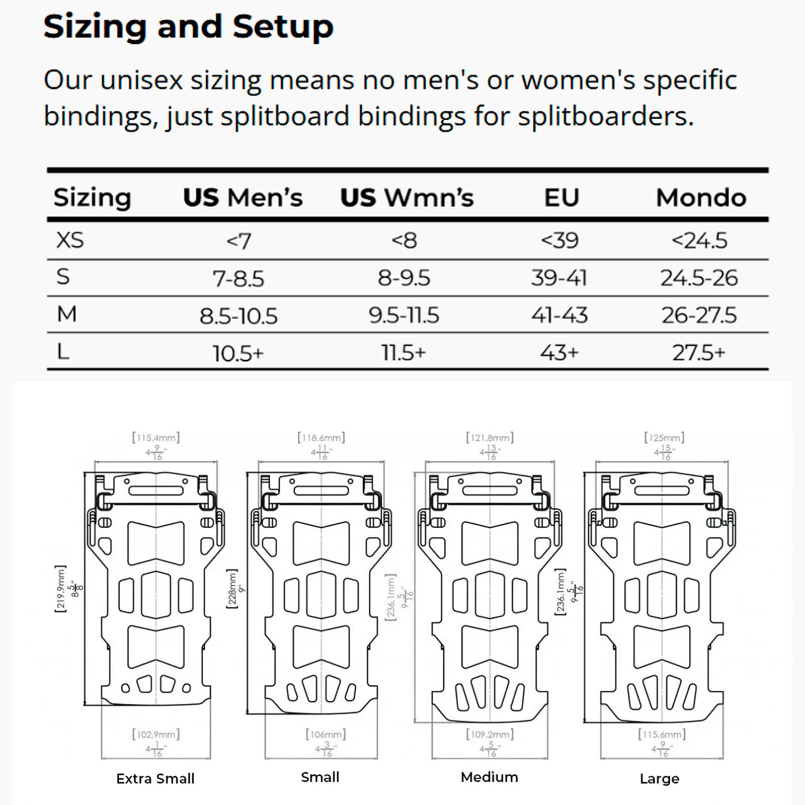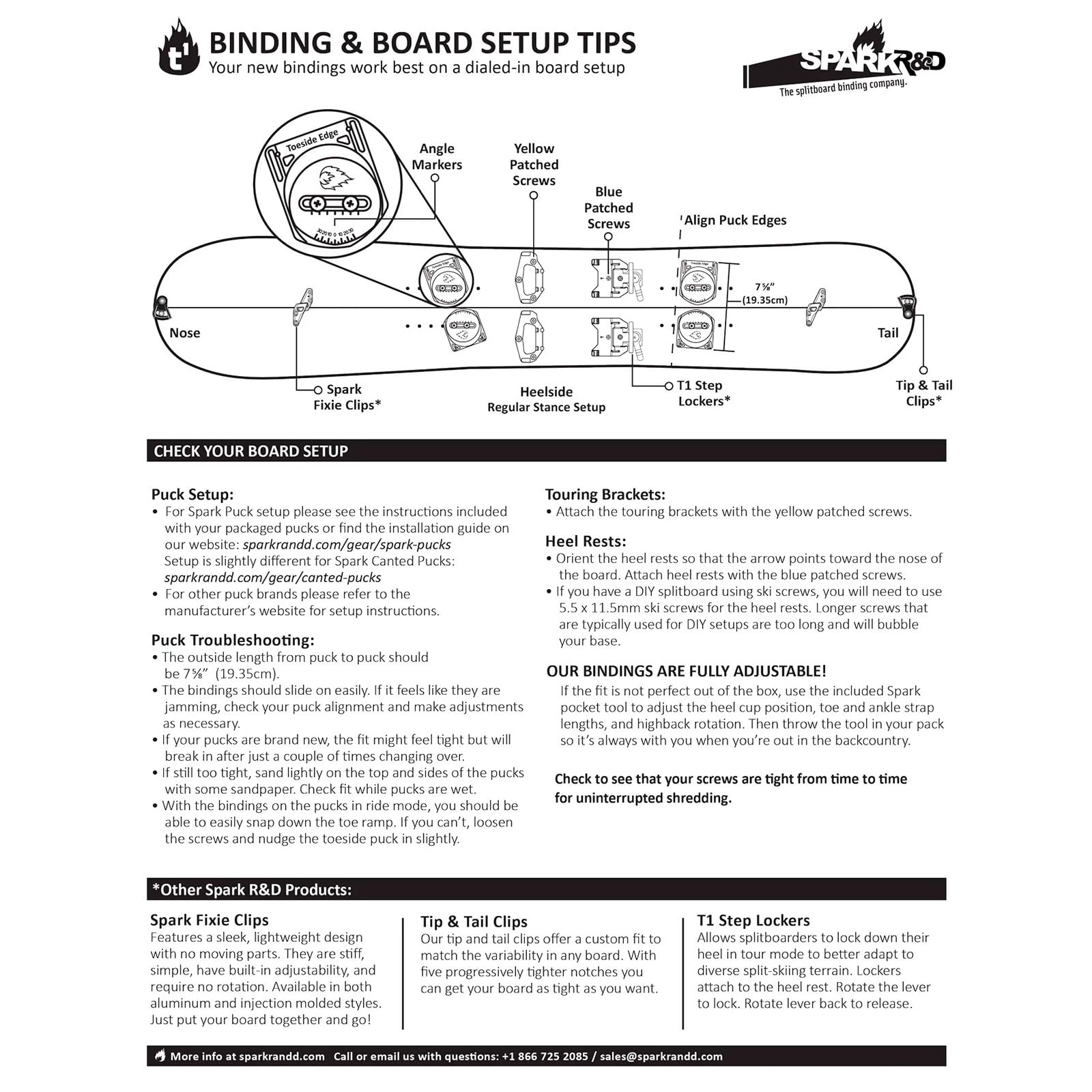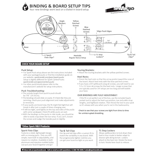 Details: SPARK R&D ARC ST BINDINGS: The Spark Arc ST Bindings are engineered for the splitboarder who demands a premium feel without compromising efficiency on the uphill. Our industry-leading splitboard binding excels in the trees and powder, but is tough enough to handle more complex all-mountain conditions. Cutout baseplate design, medium flex Asym Rip 'N' Flip Highbacks, and a smaller ankle strap with a flex window combine to save valuable grams and deliver a surfy ride down. All Arc ST Bindings incorporate our industry-leading Tesla T1 technology. Our Smooth Touring (ST) Tech is featured on our ST Brackets and ST Whammy Bars. These components utilize a proprietary thermoplastic blend that is molded over the metal part reducing friction, increasing durability, and improving touring efficiency. Together, these features create a binding that delivers an unmatched combination of lightweight touring performance and a responsive ride. The Spark R&D Arc ST Bindings are a top-tier choice for the advanced-to-expert splitboarder who refuses to compromise on the descent. MAIN FEATURES: - Puck Compatibility; - Tesla Snap Ramp; - T1 Heel Rest; - Buckles & Plastics. IN THE BOX: Splitboard bindings, ST Brackets, T1 Heel Rests, mounting screws, and Spark Pocket Tool.